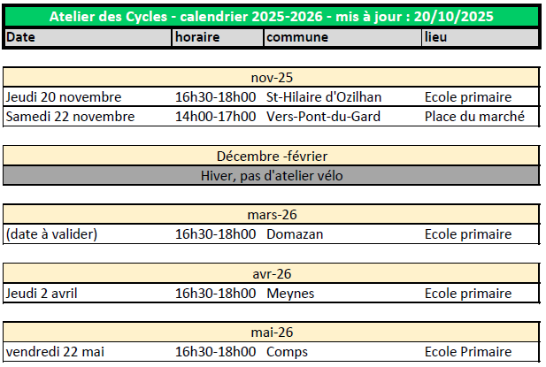 Le calendrier de passage des ateliers est établi au moins deux mois à l'avance. Cette page est mise à jour régulièrement, n'hésitez pas à la consulter.