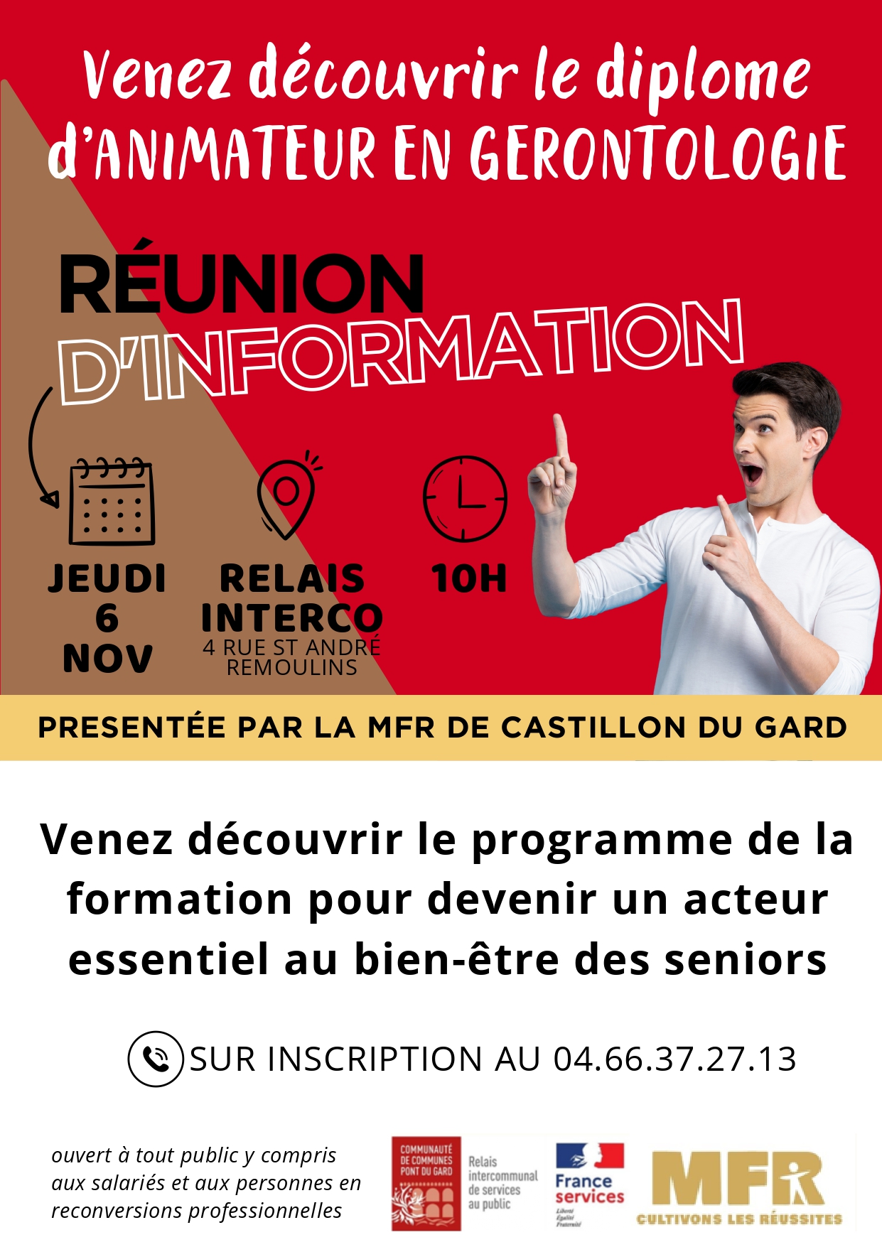 Le Relais Intercommunal de Services au Public, en partenariat avec la MFR de Castillon-du-Gard, organise une réunion d’information sur le titre d’Animateur en Gérontologie.