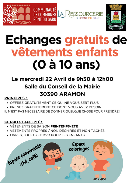 La Communauté de Communes du Pont du Gard, en partenariat avec la Ressourcerie du Pont du Gard organise une bourse aux vêtements enfants (0 à 10 ans), le mercredi 22 avril de 9h30 à 12h, à la salle du Conseil de la Mairie d'Aramon.