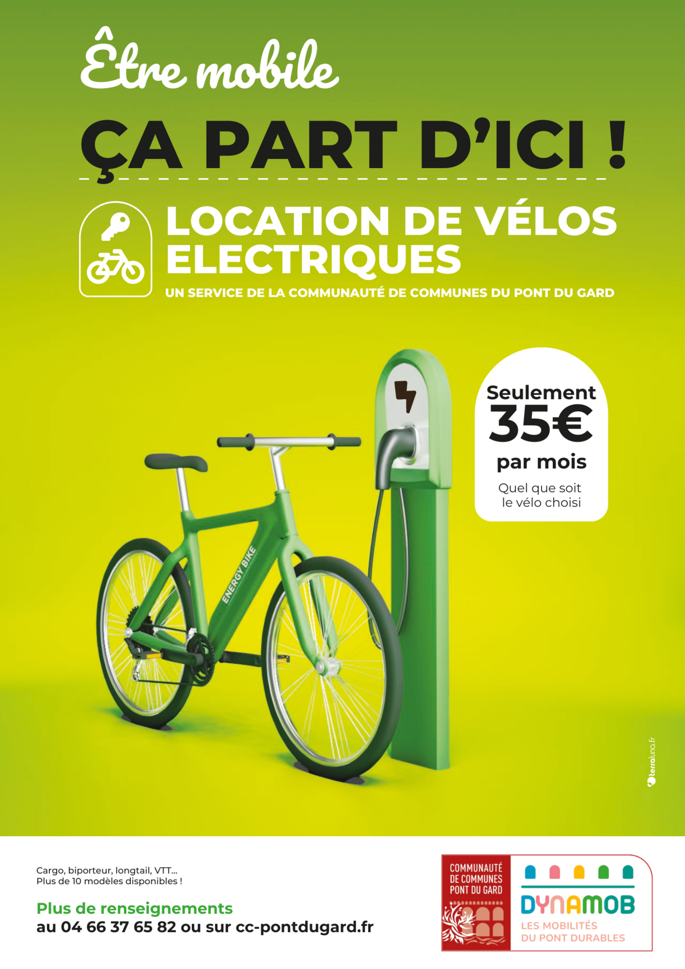 La Communauté de communes du Pont du Gard propose une solution de mobilité accessible et adaptée à tous les usages, avec 10 modèles de vélos disponibles à la location pour seulement 35€/mois.